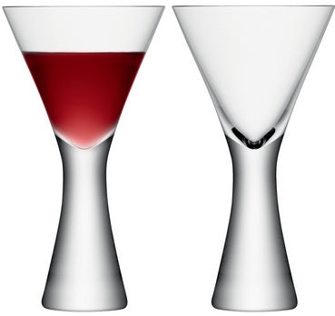 Un set de deux verres à vin de style contemporain avec des tiges en verre épaisses et solides et des bols fin évasés.