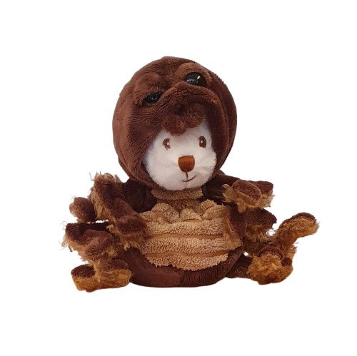 Cette jolie petite araignée en peluche toute douce est rigolote avec ses multiples pattes et sa capuche qui, une fois enlevée, dévoile une tête d'ours.