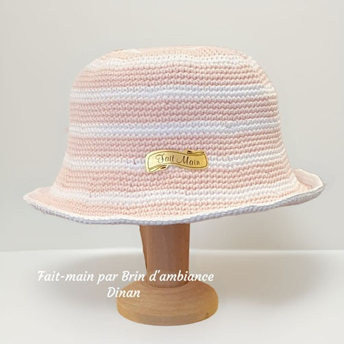 Ce joli chapeau rose et blanc "fait-main" au crochet est réalisé avec un coton très doux pour bébé.
