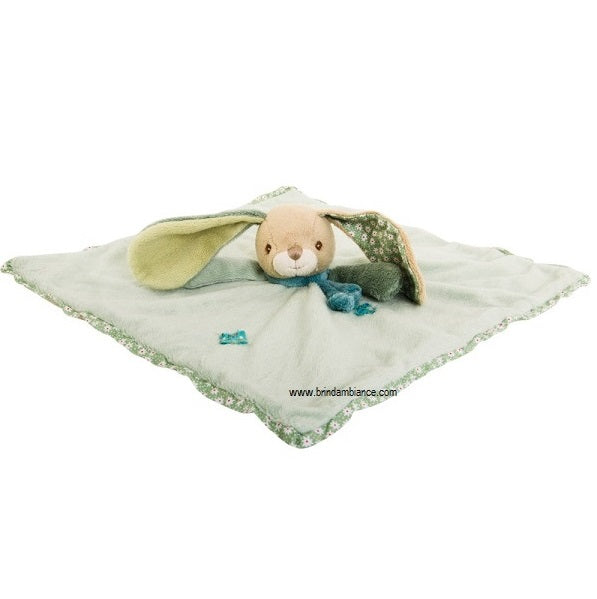 Ce joli doudou plat vert tendre avec une tête de lapin et ses grandes oreilles séduira bébé avec ses couleurs pastels.