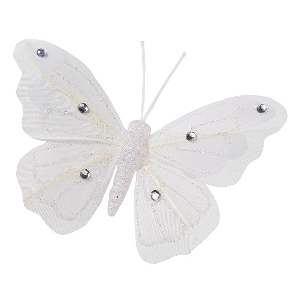 Planche de 3 papillons blancs brillants parsemés de strass fournis avec des points autocollants.
