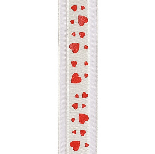 Ce ruban parsemé de cœurs est en satin et organza.