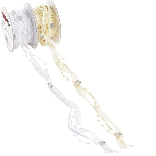 Ce ruban triple constitué d'un ruban en organza, un ruban de satin et un ruban de perles et diamants sera parfait pour embellir une création, décorer un centre de table ou un bouquet.