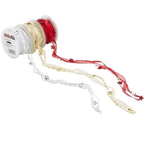 Ce ruban triple constitué d'un ruban en organza, un ruban de satin et un ruban de perles et d'étoiles sera parfait pour embellir une création, décorer un centre de table ou un bouquet.