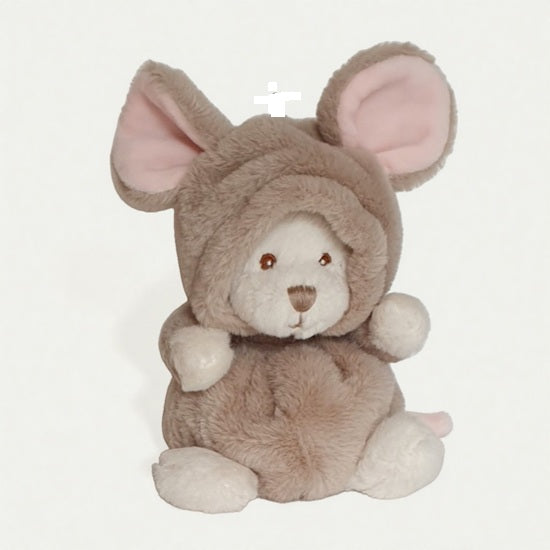 Cette petite souris en peluche toute douce est amusante avec sa capuche qui, une fois enlevée, dévoile une tête d'ours.