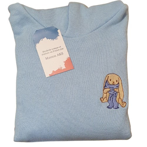 Sweat-shirt bleu à capuche et poche kangourou - Broderie "Lapin à écharpe bleue".