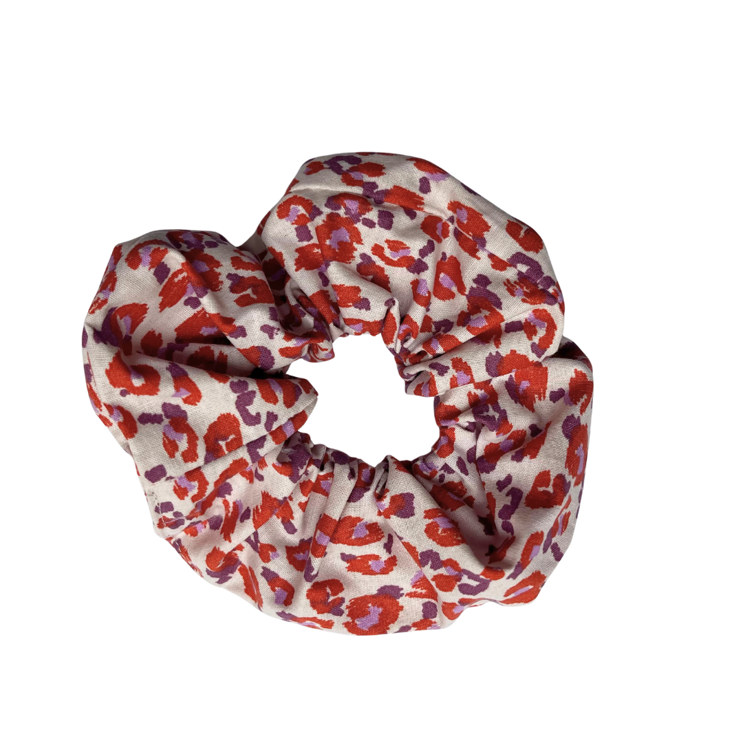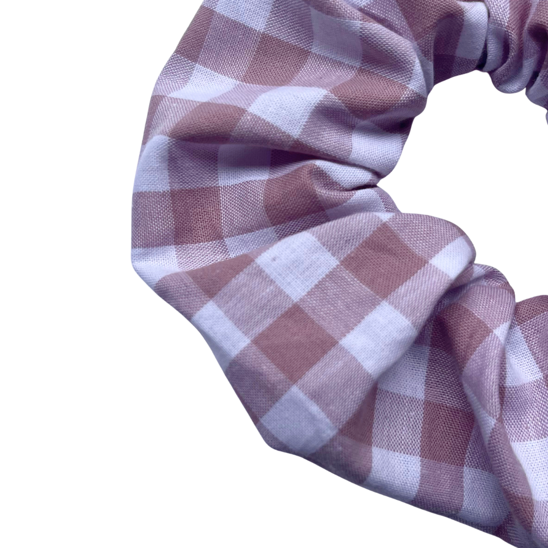 Motifs : chouchou en coton léopard rose et violet, chouchou en coton vichy vieux rose, chouchou en coton rayures parme et blanc.